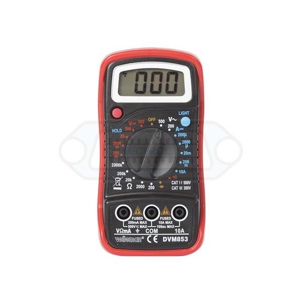Multímetro Digital Velleman DVM853 CATIII 300 V / CATII 500 V – 10 A – 1999 cuentas con retención de lectura, retroiluminación y zumbador.