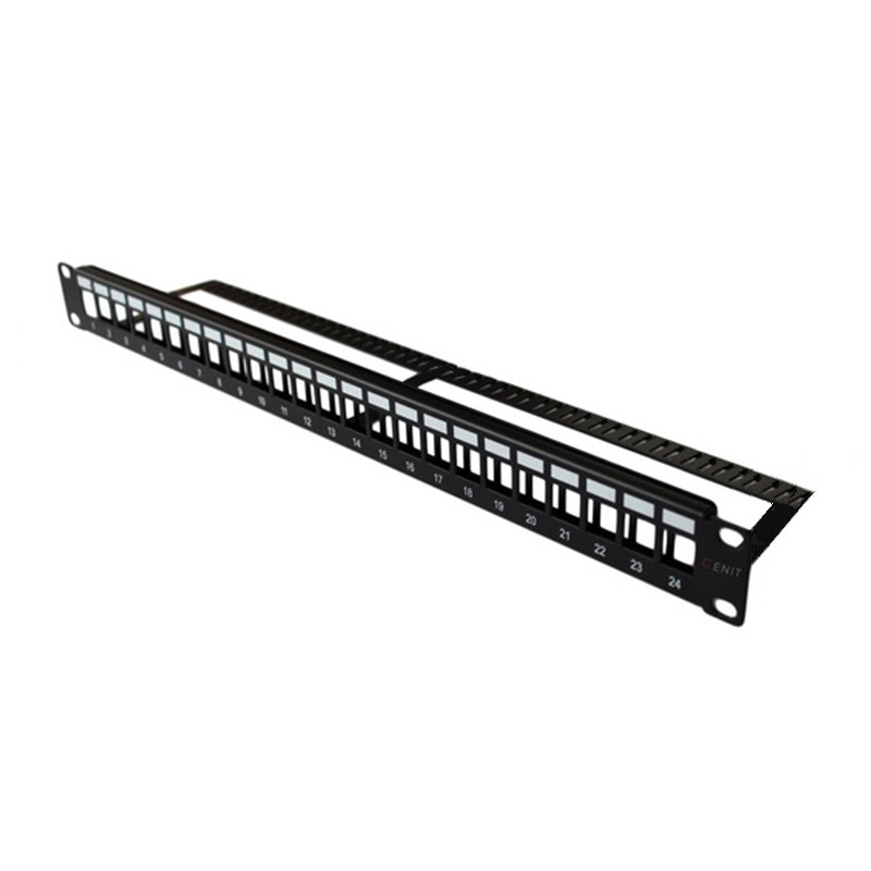 Patch Panel Vacío de 19″ de 24 puertos RJ45 con organizador troquelado trasero para cables.