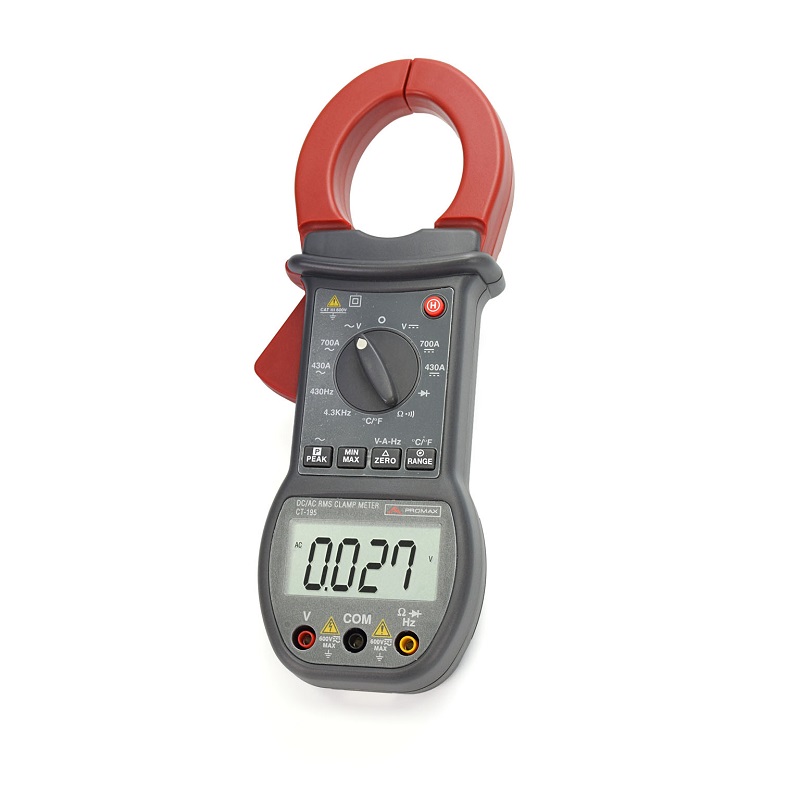 Pinza amperimétrica multifunción Promax CT-195 con medida de tensión (600 V), corriente (700 A), resistencia, frecuencia, continuidad, temperatura y prueba de diodos.