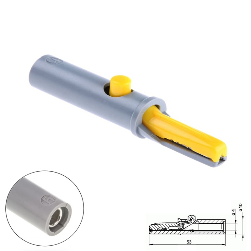 El accionamiento sencillo con botón pulsador para abrir la mordaza permite sujetar hasta 6 mm. Solo la mordaza inferior tiene un área de contacto estañado. Adecuado para sujetar cables finos. Conexión a través de conector macho descubierto de 4 mm.