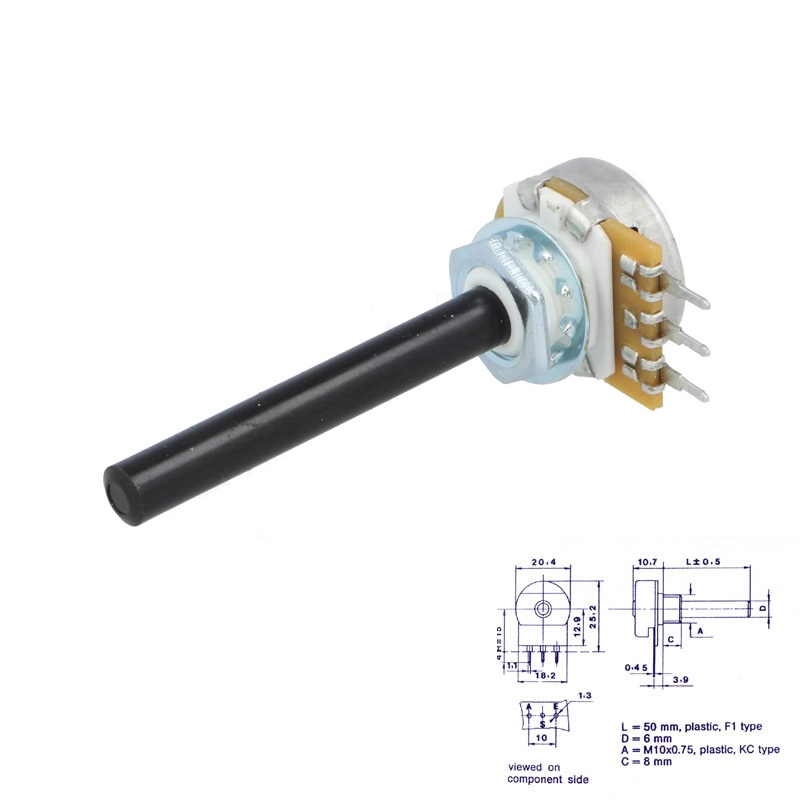 Potenciómetros giratorios de 20mm con capa de carbón para montar en CI. Caja metálica y eje de plástico (Ø 6mm). Interruptor unipolar opcional (1A – 24VDC / 0.3A – 250VAC).