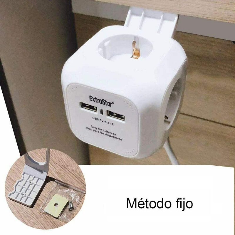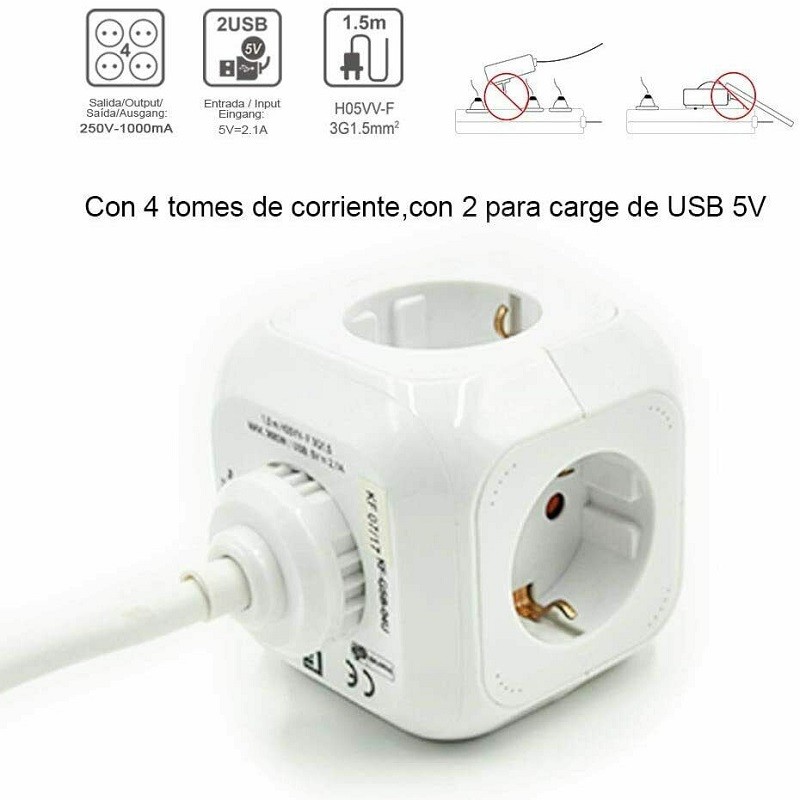Multiple con 4 tomas de corriente adicionales en un diseño cúbico evitando superposiciones de los cables.