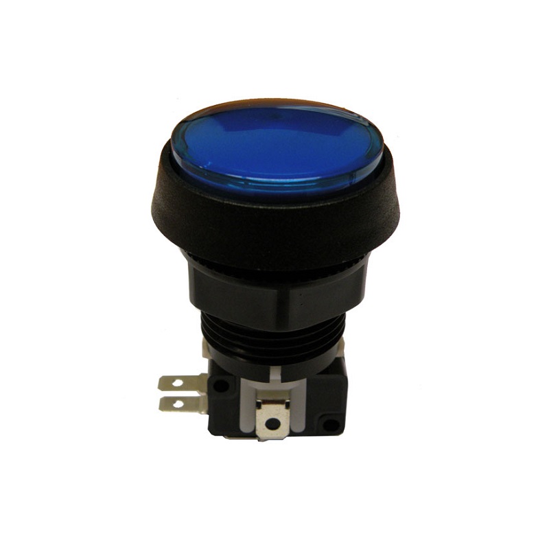Pulsador Arcade luminoso redondo Ø44mm (SPDT) ON-ON 12A 125/250VAC con botón en color azul, rosca montaje Ø28, para uso con bombillas de 12V tipo T10