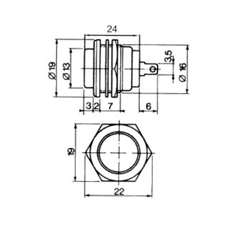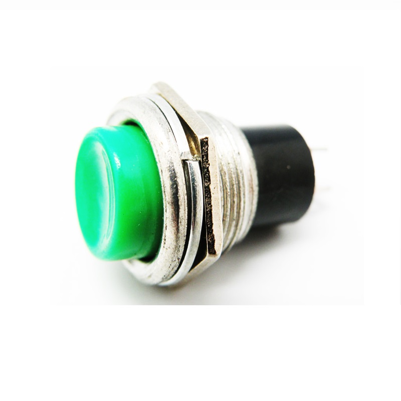 Pulsador metálico OFF-ON Normalmente Abierto (NO) 125V 3A con rosca de Ø16mm., botón en color verde