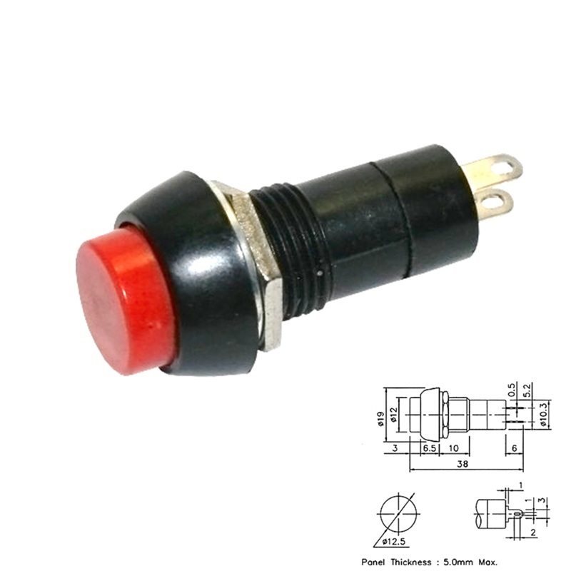 Pulsador redondo Ø19mm de 1 circuito OFF-(ON) 3A/125V montaje en chasis Ø12.5mmm, cuerpo negro, tecla en color rojo