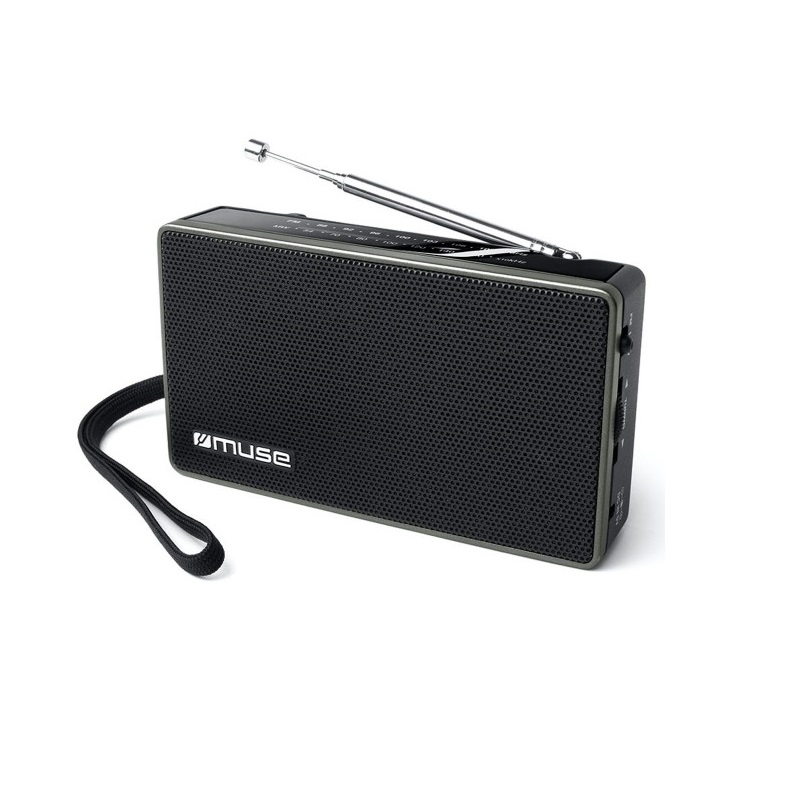 Radio analógica de portátil FM/AM Muse M-030R con altavoz integrado y conexión de auricular.