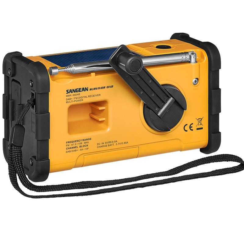 Radio de Emergencia con manivela y carga solar DAB+ / FM SANGEAN Survivor DAB MMR-88 DAB+, acabado en color amrillo-negro.