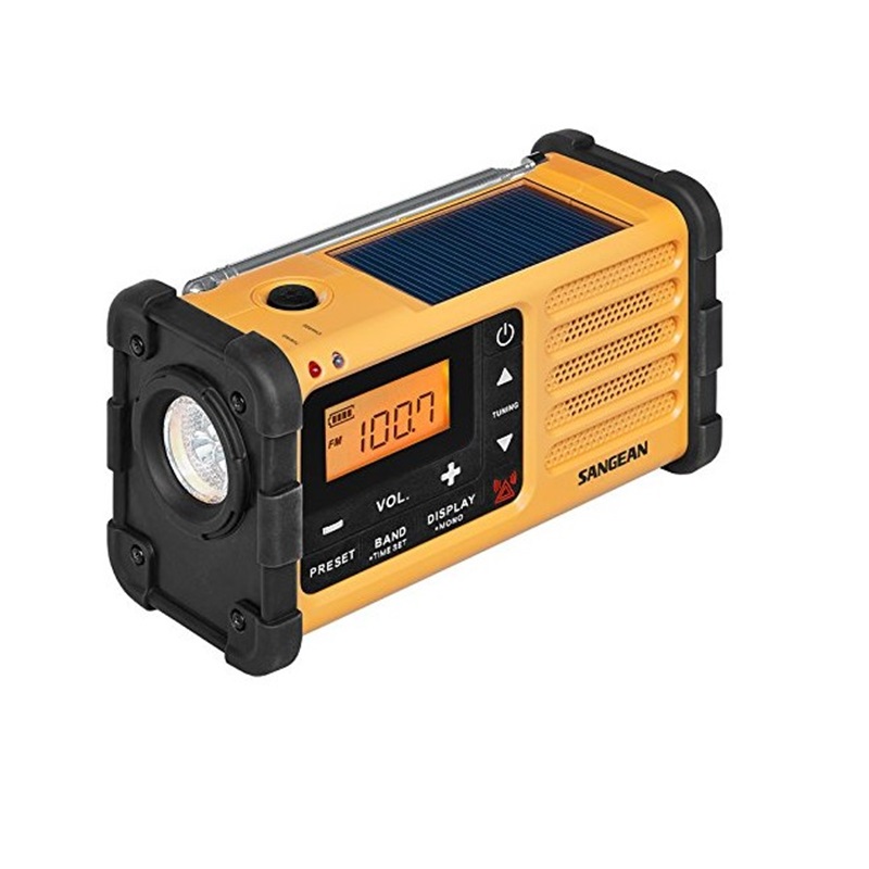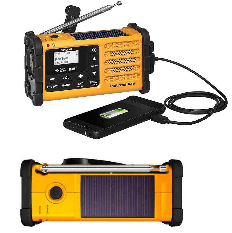 Radio digital de emergencia DAB+ / FM Sangean MMR-88, 20 presintonías, linterna, USB carga, batería recargable por manivela o panel solar incorporado.