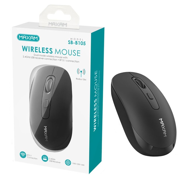 Ratón inalámbrico modo dual con 2.4GHz USB receptor y Bluetooth 5.1 DPI 1000-1200-1600 Maxam SB-B105 color negro.