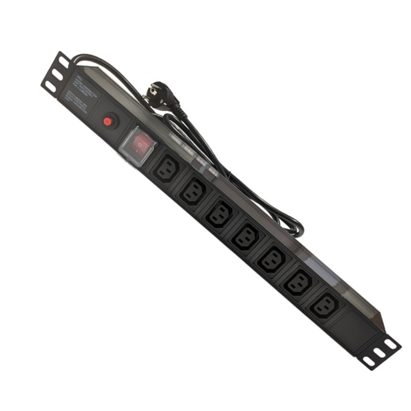 Regleta eléctrica para Rack 19″ 1U con 7 tomas IEC C13 hembra, con interruptor I/O y piloto LED indicador, acabado en PVC de color negro
