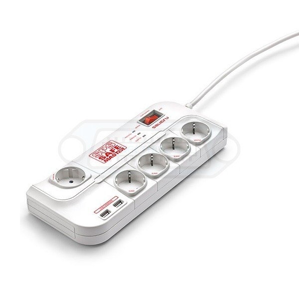 Regleta con proteción eléctrica 5 tomas schuko + 2 USB Salicru SPS SAFE MASTER con filtro EMI/RFI y encendido/apagado automático de los periféricos.