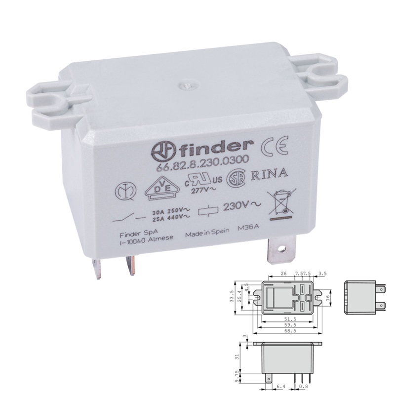 Portada Tienda Componentes Electrónicos Relés Relés de Potencia RELÉ DE POTENCIA FINDER 66.82 AC 230V (2Co) 30A FASTON SOLDAR