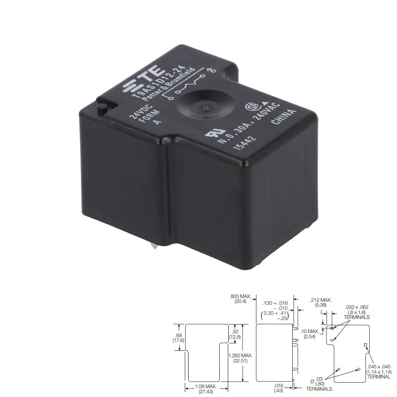 Relé de potencia electromagnético TE CONNECTIVITY Serie T9A S1D12-24 bobina 24V DC, 30A, 1 circuito (SPST-NO), 4 pines, montaje en circuito impreso