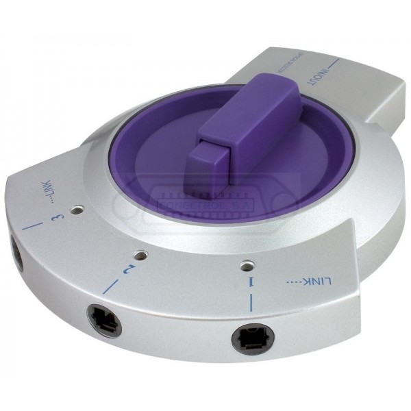 Repartidor manual de señales de fibra óptica que puede conmutar hasta con tres orígenes o destinos de señal.