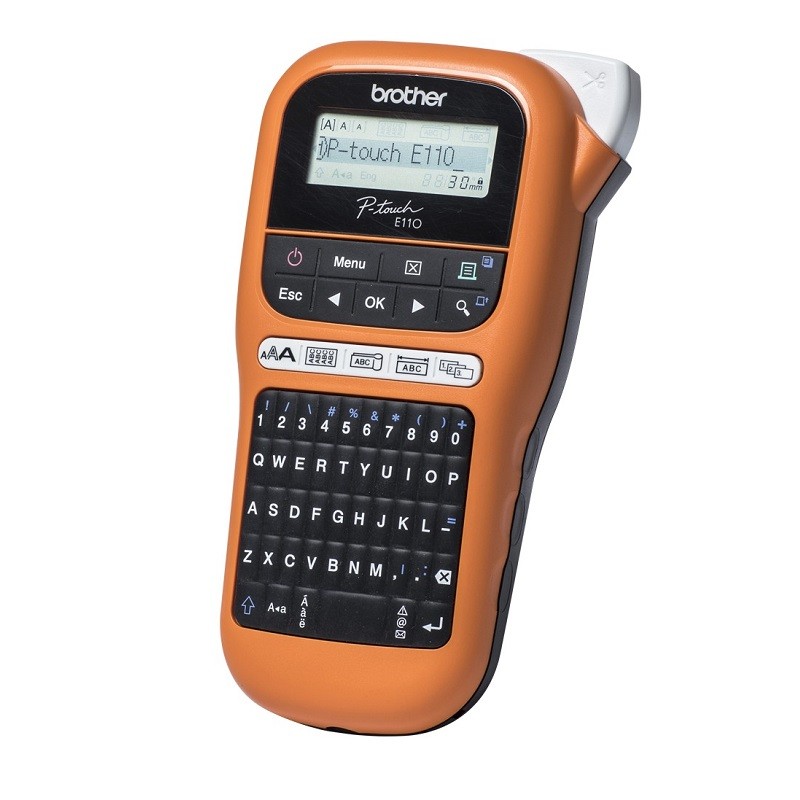 Rotuladora electrónica portátil profesional BROTHER P-TOUCH PT-E110 ideal para electricistas e instaladores, incluye 1 casete de cinta negro sobre blanco 12mm x 4m.