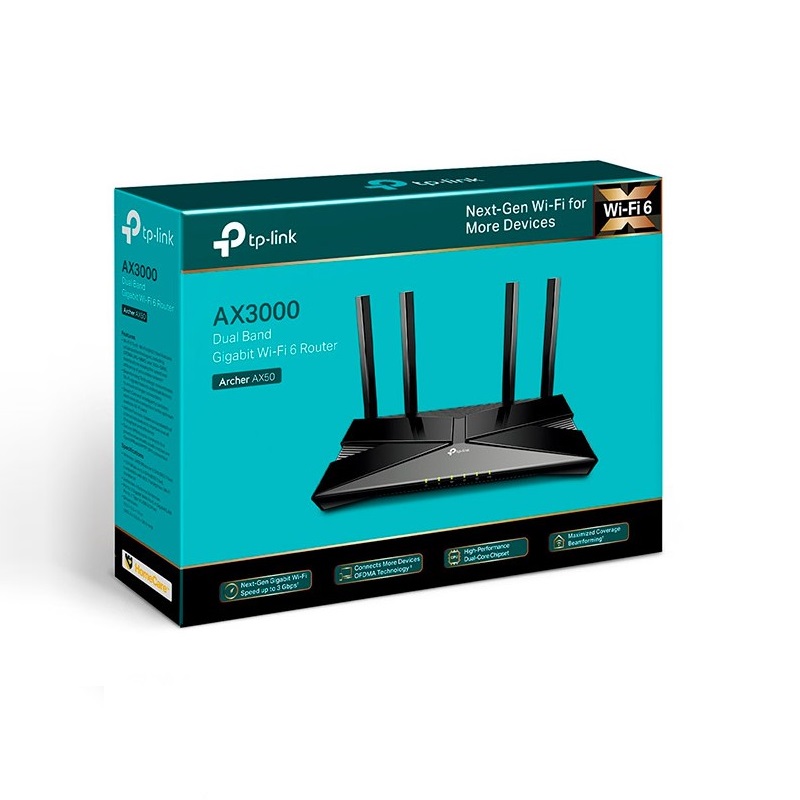 Tecnología Wi-Fi 6. Archer AX50 viene equipado con última tecnolgía inalámbrica Wi-Fi 6, para alcanzar velocidades más altas y mejor rendimiento de la red.