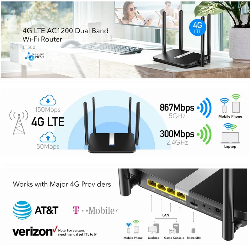 Router Wi-Fi 4G LTE AC1200 Dual Band CUDY LT500 2.0 con 4 puertos Lan 10/100Mbps y ranura para tarjeta Nano SIM