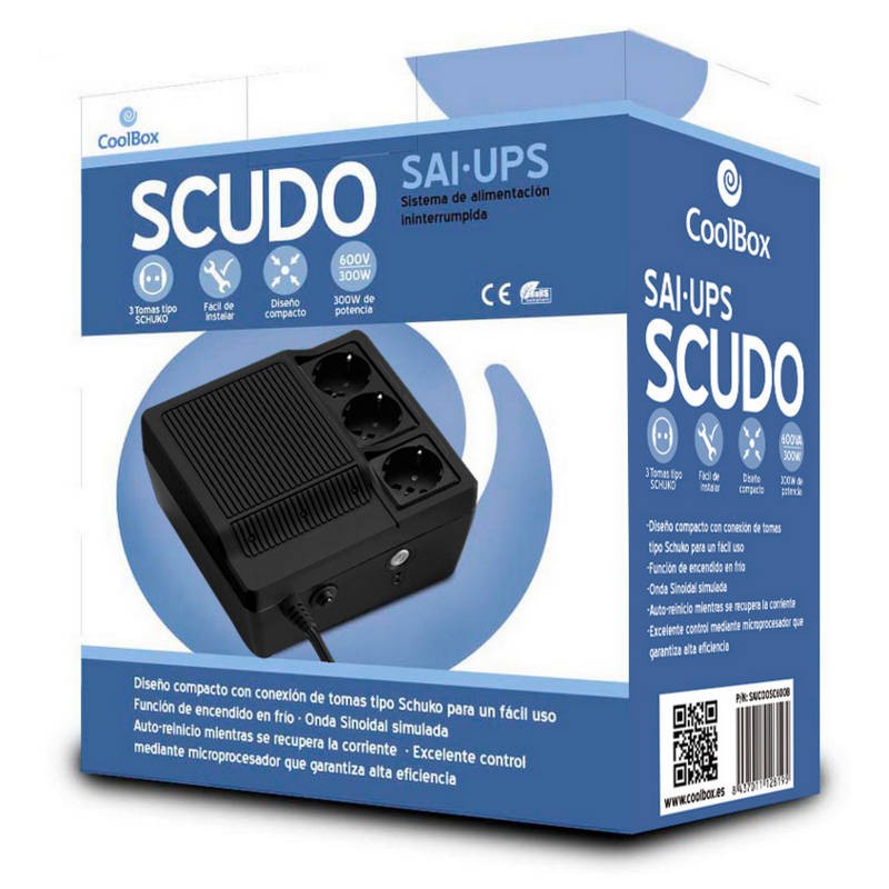 Sistema de alimentación ininterrumpida CoolBox SCUDO 600 con 3 Tomas tipo SCHUKO de 600 VA, fácil de instalar, diseño compacto, ideal para el entorno doméstico y la pequeña oficina.