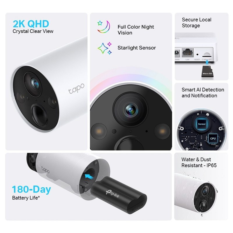 (1) La duración de la batería de hasta 180 días se basa en las pruebas de laboratorio de TP-Link que activan de 10 a 20 eventos por día. La duración real de la batería puede variar según la configuración del dispositivo, el uso y los factores ambientales.