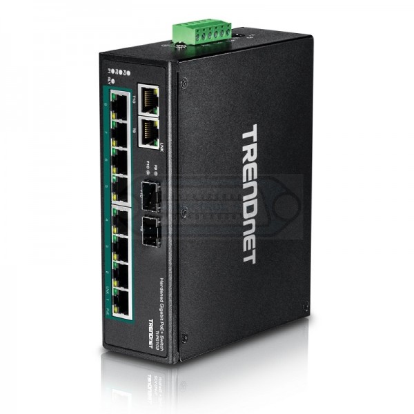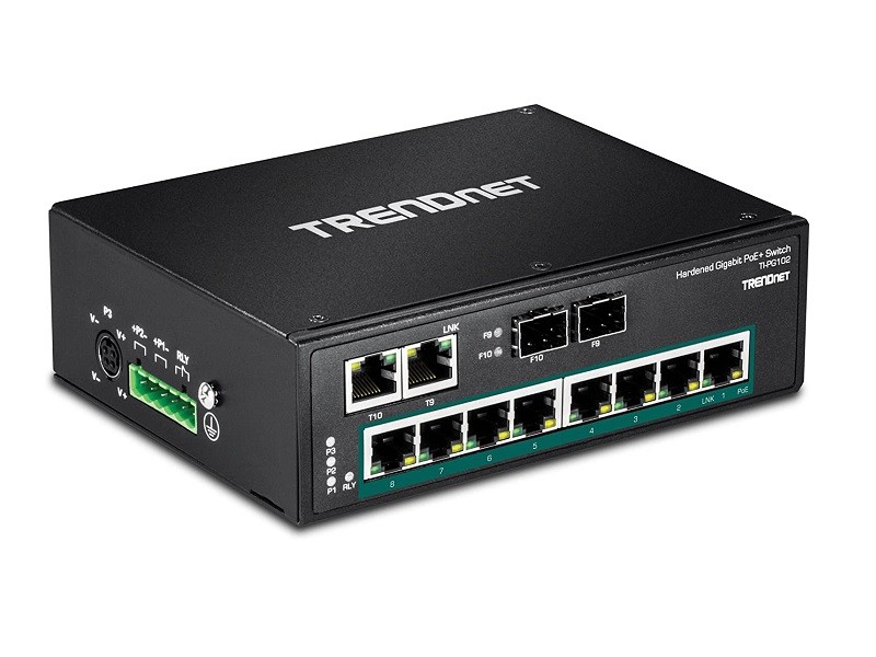 El switch industrial Gigabit DIN-Rail de 10 puertos de TRENDnet, modelo TI-PG102, dispone de ocho puertos gigabit PoE+ con una potencia PoE disponible de 240 W más dos puertos gigabit RJ-45 / SFP compartidos. Los usuarios pueden conectar hasta ocho dispositivos PoE+ al switch, disponiendo al mismo tiempo de dos puertos gigabit para conexiones de red adicionales. Está equipado con una carcasa de metal con clasificación IP30, diseñada para tolerar altos niveles de vibración y golpes, capaz de funcionar en un amplio intervalo de temperaturas, de -40 a 75 °C (-40 a 167 °F), para entornos industriales.