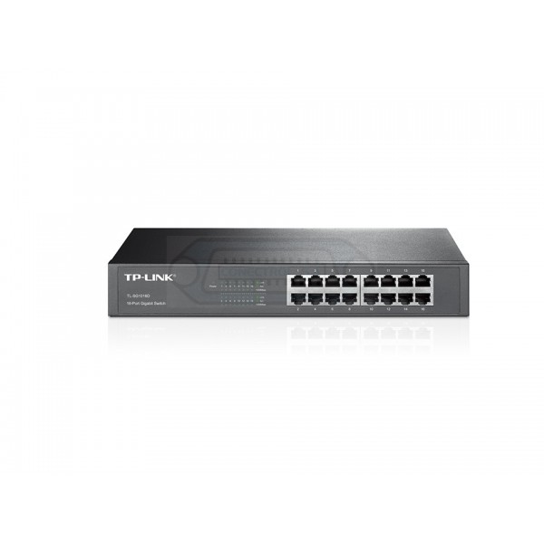 Switch TP-LINK TL-SG1016D Gigabit Ethernet con 16 puertos y auto MDI / MDIX. Incluye accesorios para montaje en Rack de 19 pulgadas.