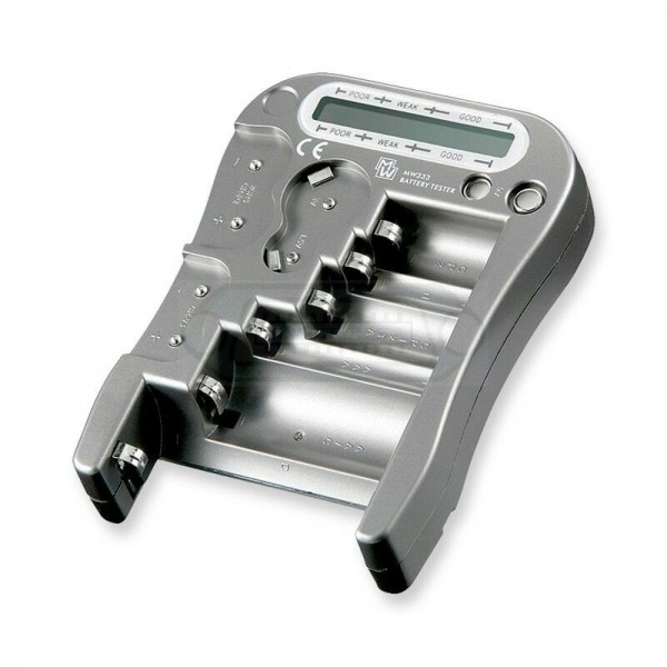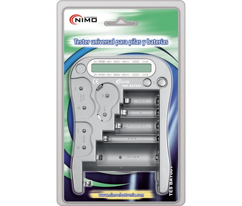 Tester universal digital de pilas y baterías con pantalla LCD para más de 12 tipos diferentes de pilas y baterías.