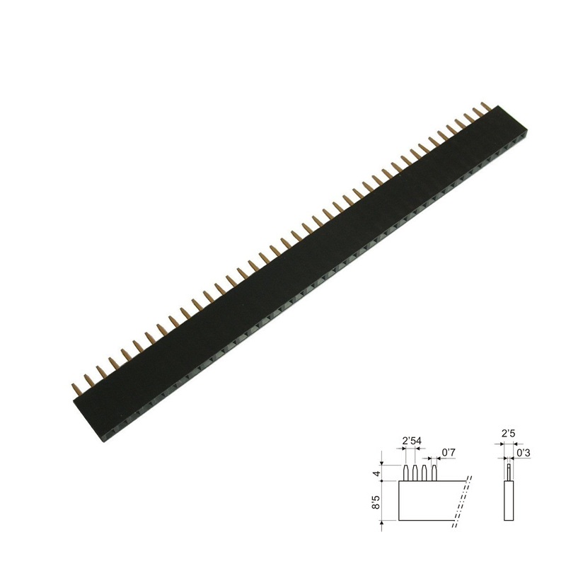 Tira de pines hembra 40 terminales recto paso 2,54mm 1 fila, para circuito impreso.