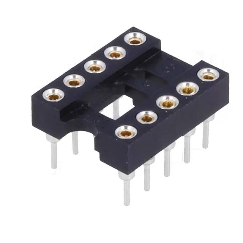 Zócalo para circuito integrado de 10 pines (2 lineas x 5 pines) contactores cilindrados, patas redondas, raster 2.54mm, DIP-10, para montaje en circuito impreso